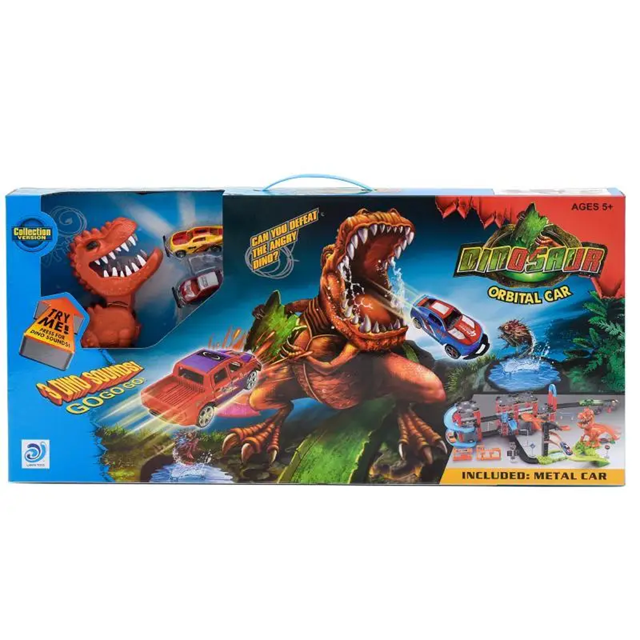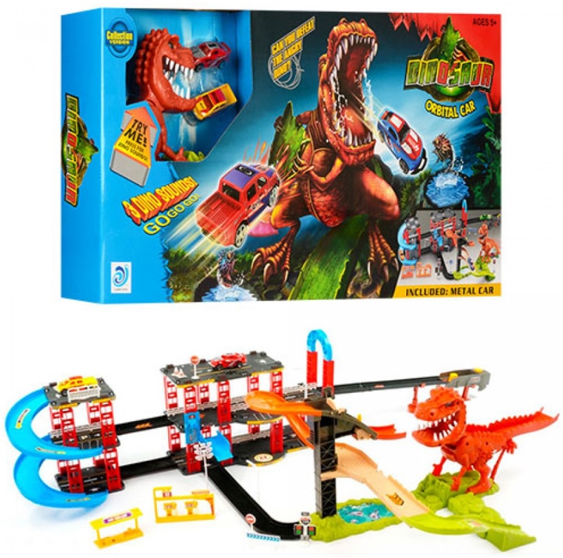 Трек має кілька рівнів, і ключовий елемент – динозавр, через відкриту пащу якого пролітають машинки. До складу входять всі необхідні елементи для збірки, 2 машинки.