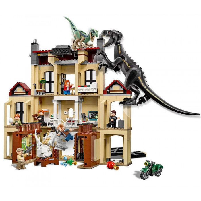 Індораптор – це особливий гібрид бойового ящера, спеціально виведеного вченими на замовлення військових. Він швидко бігає, має немислиму для таких істот спритність, а також розумний і водночас вкрай кровожерливий. Саме такі якості дозволили йому зробити втечу з клітини і влаштувати справжні руйнування в Локвуді. Відчинивши важкі двері збудованого будинку з деталей набору, ми опиняємося в холі: серед інших предметів тут особливий інтерес викликають вітрини з експонатами, присвяченими доісторичним мешканцям планети. Колекція охороняється дозорними під керівництвом Кена Уітлі; вибивання шибки героями, змушеними тікати від хижака. Або ж самим гігантським ящером, який намагається увірватися в кімнату, де ховаються люди. знаходиться лабораторія з усією необхідною високотехнологічною апаратурою, невеликий робочий кабінет господаря будинку, спальня. Центр другого поверху є відкритим майданчиком, який веде на балкон. У кімнатах заховані потаємні механізми, що допомагають розіграти історію з максимальною точністю. Тому у власника іграшки у будь-який час є можливість внести суттєві зміни у конфігурацію житлових кімнат. Тобто відійти від схем, наведених в інструкції зі збирання. Окрім основної споруди в комплект набору входять мотоцикл, великий макет черепа Трицератопса на підставці, рухомі фігурки 12-сантиметрового Індораптора та маленького Блю. Досить багато в іграшці різноманітних аксесуарів. А присутність такої великої кількості персонажів робить її дуже перспективною за ігровим потенціалом.