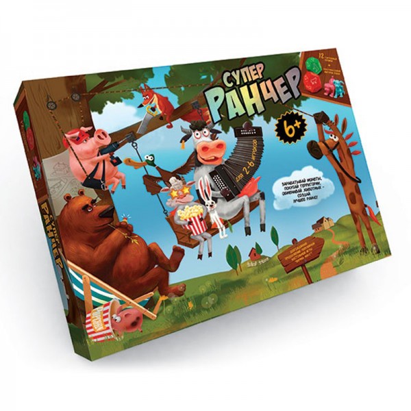 Настільна розважальна гра “Супер ранчер” (G-SR-01-01U). Продовження популярної гри “Ферма Люкс”, Вам необхідно буде заробляти монети, купувати території і проявити стратегічне мислення. Для перемоги потрібно зібрати хоча б по одному виду всіх тварин. Для 2-6 гравців. У наборі: ігрове поле, 6-гранний кубик, два 12-гранні кубики, 3 великі фігурки, 3 маленькі фігурки собак.