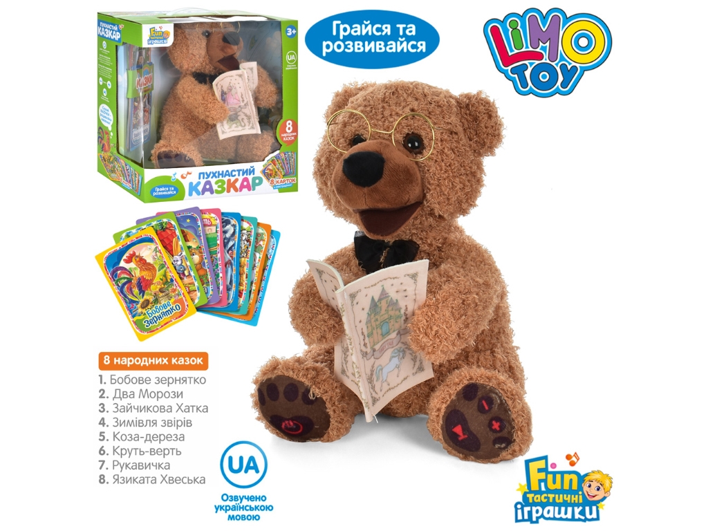 - Працює від трьох батарейок типу AA (не входять у комплект).Цей ведмедик-казкар озвучує 8 українських народних казок: